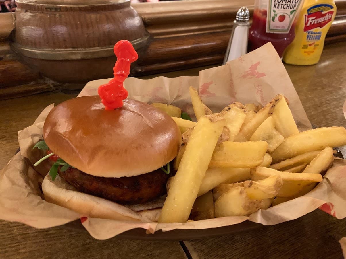 Overall, the food is fancier at Disneyland Paris. The Lucky Nugget (equivalent to The Golden Horseshoe), provides thick napkins, real glasses, and real silverware. Burgers come with aioli, sauteed mushrooms, and arugula. The french fries are remarkably “boat shaped” which means they are cut lengthwise in a V shape so there is a trench down the center to hold your ketchup. The cost of a burger and fries is $16.55, while at The Golden Horseshoe entrees run between $8.50-$11.50.
